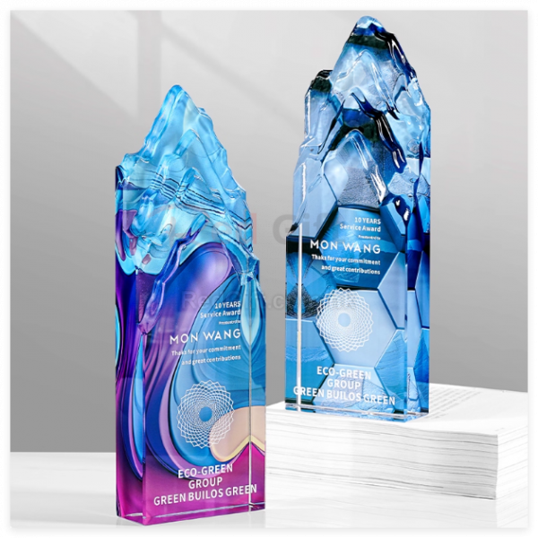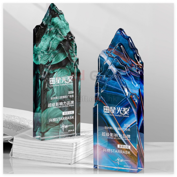 水晶獎座:水晶獎座有著水晶晶瑩剔透的優勢,手感細膩,還可以刻字,紋圖案,造型也基本可以達到金屬獎座的形狀。製作水晶獎座大致可分為選料、開料、壓胚、粗拋光、細拋光、打孔、鍍彩、雕刻、噴砂、包裝十個步驟。水晶獎座的雕刻工藝可分為平面雕刻和鐳射內雕。另外,基於訂製水晶獎座材質的特性,在運輸包裝與保養方面也有講究。