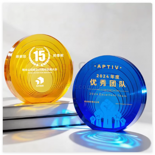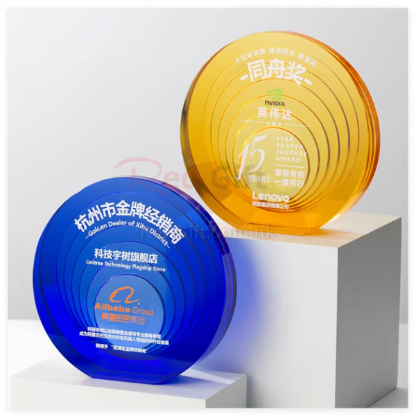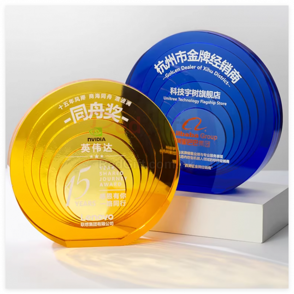 水晶獎座:水晶獎座有著水晶晶瑩剔透的優勢,手感細膩,還可以刻字,紋圖案,造型也基本可以達到金屬獎座的形狀。製作水晶獎座大致可分為選料、開料、壓胚、粗拋光、細拋光、打孔、鍍彩、雕刻、噴砂、包裝十個步驟。水晶獎座的雕刻工藝可分為平面雕刻和鐳射內雕。另外,基於訂製水晶獎座材質的特性,在運輸包裝與保養方面也有講究。