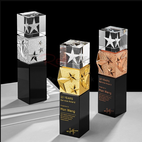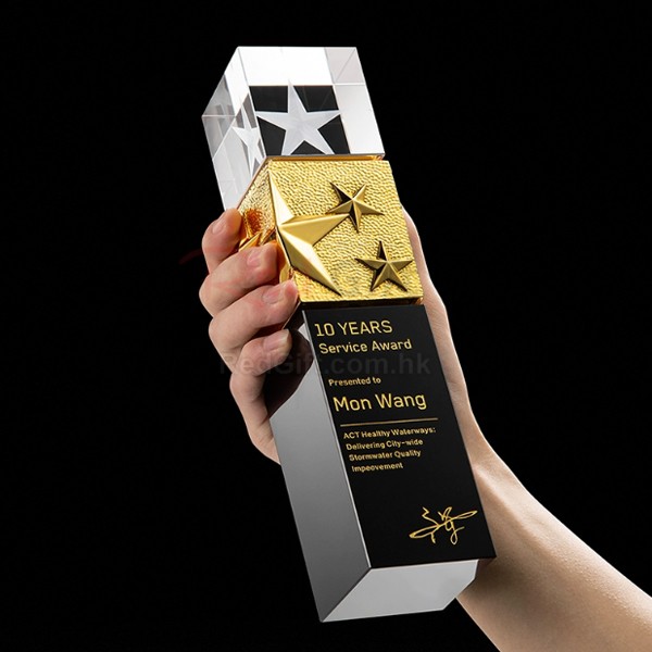 | 水晶獎座:水晶獎座有著水晶晶瑩剔透的優勢,手感細膩,還可以刻字,紋圖案,造型也基本可以達到金屬獎座的形狀。製作水晶獎座大致可分為選料、開料、壓胚、粗拋光、細拋光、打孔、鍍彩、雕刻、噴砂、包裝十個步驟。水晶獎座的雕刻工藝可分為平面雕刻和鐳射內雕。另外,基於訂製水晶獎座材質的特性,在運輸包裝與保養方面也有講究。 |